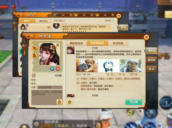 玩家等级达到13级时,该系统将随着社交系统同步开启。桃花岛为社区交互玩法,玩家可以在个人桃花岛内自定义头像、编辑个人信息、发布心情、访问好友等操作,在编辑个人信息时,系统支持语音与文字两种模式。在“我的桃花岛”中可以看到关注的好友发布的心情和动态。发布心情时支持上传图片,喜欢自拍和美图的小伙伴可以在游戏中自由分享心情动态。访问他人桃花岛时可以评论对方心情或点赞,在桃花岛系统内与好友可以互送礼物和祝福,也可通过设置屏蔽他人访问。桃花岛内另有留言板,可以查看访问者的留言信息,或给访问的好友留言。在桃花岛热点中可以看到所有服务器、当前服务器的热门话题。